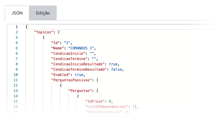 Você poderá alterar a funcionalidade do robô de duas formas distintas, por JSON ou pelo Editor visual. Sendo que as alterações realizadas no editor serão refletidas no JSON e vice-versa.