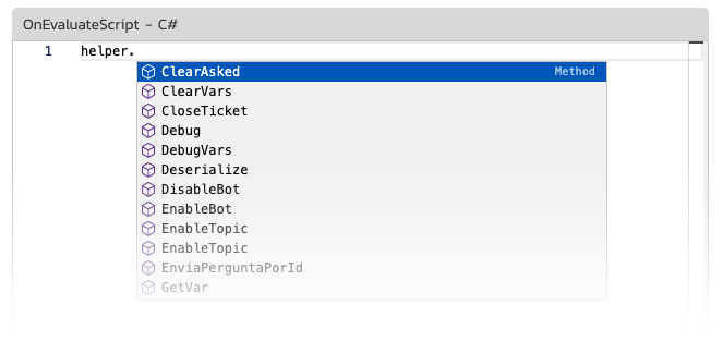 Diversos aspectos do robô poderão ser programados para melhor atender sua empresa. Você terá acesso à todas as funções do robô diretamente no editor de código: