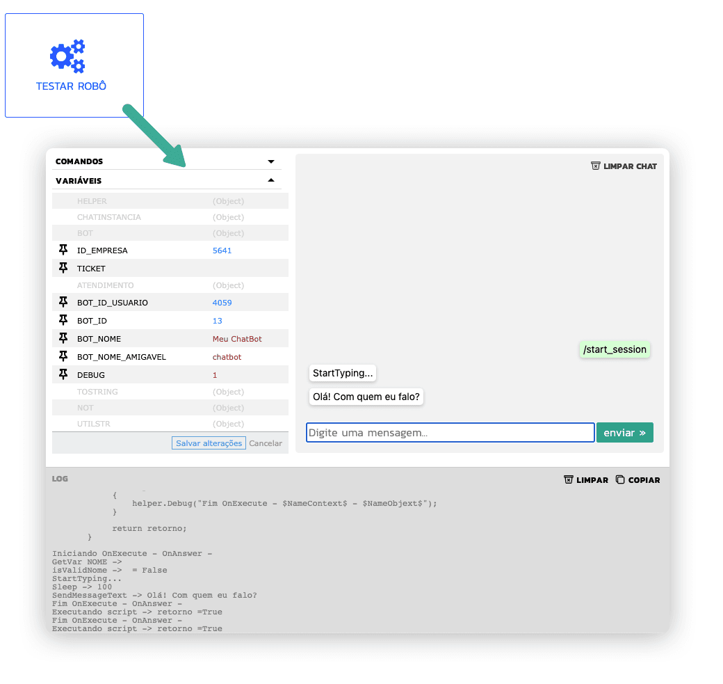Antes de colocar o robô para uso é crucial que você faça todos os testes necessários. Para isso utilize a ferramenta disponível para testes: