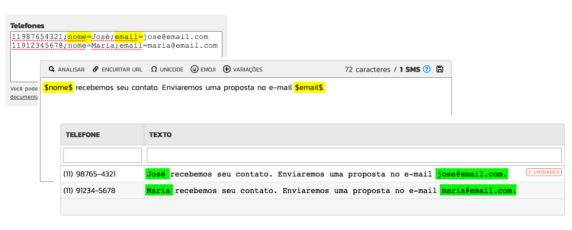 Juntamente com o telefone do destinatário, é possível inserir variáveis customizadas: