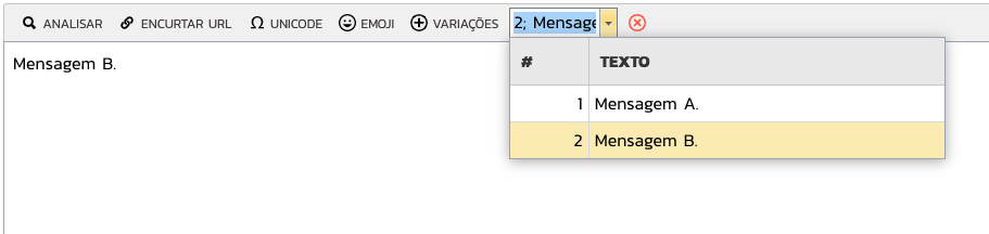 Ao inserir uma nova variação, a mensagem atual será salva automaticamente, e o editor será limpo para a inserção de uma nova mensagem.
